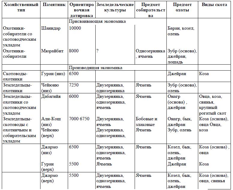 Таблица 2. Хозяйственные типы на Древнем Востоке в X—VI тыс. до н. э.