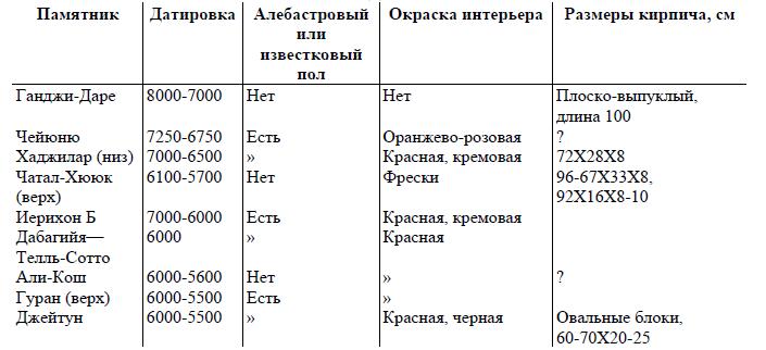 Если говорить о древнейшей строительной традиции на Ближнем Востоке как о комплексе из трех названных элементов, то в наиболее раннем варианте она представлена в Юго-Восточной Турции в поселениях земледельцев-охотников (Чейюню) и охотников-собирателей с земледельческим укладом (докерамический неолит Хаджилара). Отсюда она могла распространиться на юг в Иерихон Б, где одновременно появляется пшеница-однозернянка, отсутствовавшая в слоях Иерихона А и не имевшая дикорастущего предшественника в Палестине. Распространение вышеупомянутых приемов на восток в зону Загроса отмечено лишь для поздних этапов комплексов типа Джармо. Наконец, эту традицию мы застаем на крайнем северо-востоке тогдашней раннеземледельческой ойкумены — в Джейтунской культуре Южного Туркменистана. Правда, длинные глиняные «протокирпичи» (блоки), используе-