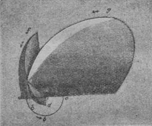 Орбита Земли abc (см, рис. 44) находится в плоскости бумаги. Над ней поднимается орбита кометы Биэла — aed, и таким образом они имеют общую точку а. Одновременно обозначена буквами def еще орбита другой периодической кометы, кометы Энке. Орбита кометы Энке имеет в свою очередь общую точку е с орбитой кометы Биэла; следовательно, в этой точке е эти оба светила могут когда-нибудь встретиться.