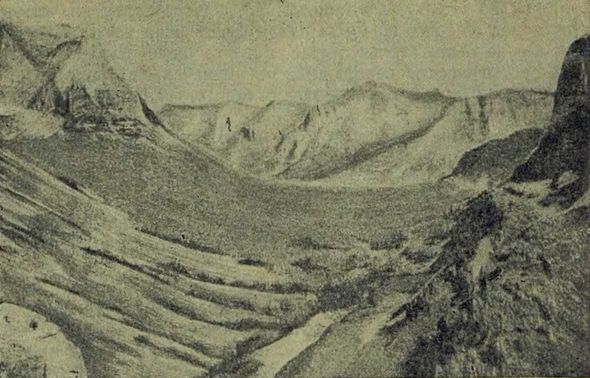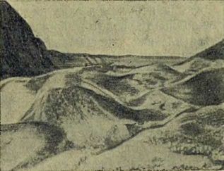Ледник спускается с горы медленно; но он так огромен, — иногда толщиной в несколько сот метров, — что его движению ничто не может противостоять; он давит всем своим весом, с несокрушимой силой. Он прорывает в горах себе ложе, как река прорывает русло; по форме долины легко узнать, образовал ли ее проходивший тут когда-то в прежние времена ледник, или ее выточила река: речное русло суживается книзу и расширяется кверху, как римская цифра V, а ледниковое ложе походит всего больше на корыто или на французскую букву U — оно шире всего внизу. На странице 98 показана долина; вы сами легко догадаетесь, что эту долину вырыл ледник.