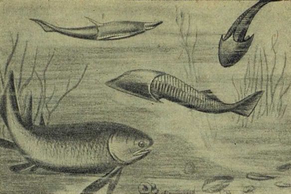 Другие рыбы в этот период приобретают особо хищный вид, как бы усиленно сооружаются. Это акула геликоприон; она похожа на нынешнюю пилу-рыбу, только у пилы-рыбы ее пила прямая, а у геликоприона она свернута спиралью.