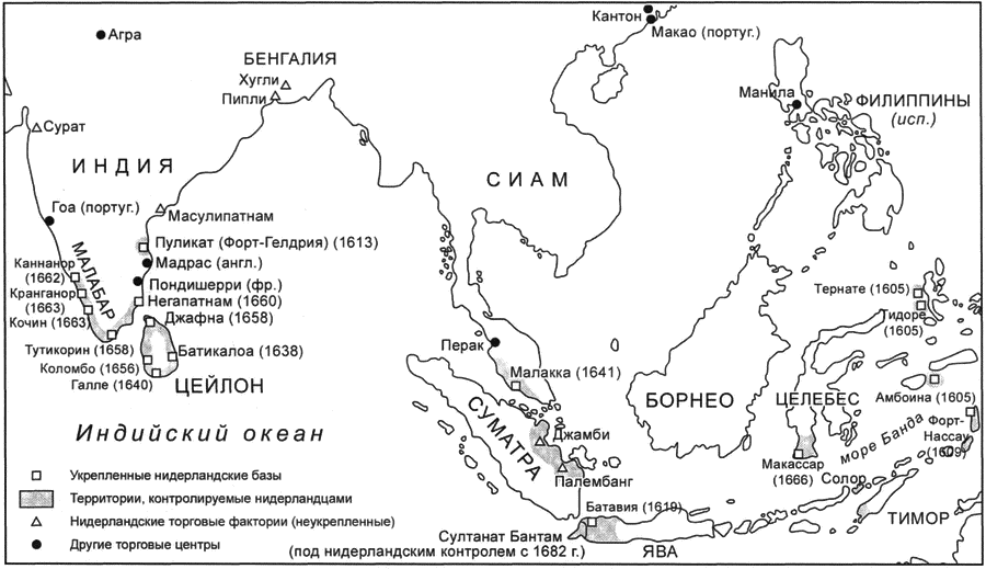 Тем временем в Ост-Индии ОИК добилась впечатляющих успехов в 1630-х и начале 1640-х гг., захватив три из шести главных португальских крепостей на Цейлоне в 1638-41 гг. в союзе с королем Канди, сингальским правителем внутренней части острова, и в 1641 г., после длительной и дорогостоящей осады, большую португальскую базу Малакку, контролировавшую проливы между Индийском океаном и Южно-Китайским морем. Таким образом, к 1640-м гг. нидерландцы прочно укрепились на Индийском субконтиненте и Малайском полуострове, а также в Индонезии (и до 1662 г. владели Тайванем). В 1650-х гг. Компания продолжала сосредотачивать свои главные военные усилия на борьбе с португальцами за Цейлон. После знаменитой осады Коломбо (1655-56 гг.) ОИК установила контроль над всей производящей корицу зоной острова. Во время войны в 1657-61 гг. между Соединенными Провинциями и Португалией (главным образом, из-за Бразилии) и ее эпилога — военных действий в Южной Индии — нидерландцы не только завершили завоевание побережья Цейлона, но также захватили и аннексировали всю цепочку португальских укрепленных баз (Негапатам, Тутикорин, Каннанор, Кранганор и Кочин), протянувшуюся вдоль южной оконечности Индии (см. карту 14). С 1660 г. до 1720-х гг. Нидерланды оставались ведущей европейской державой в Индии.