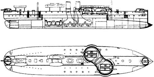 Продольный разрез и план верхней палубы броненосца «Чженг-юен»