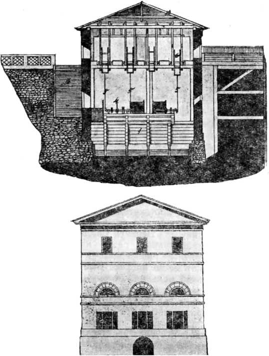 Фиг. 16. План и фасад каменной лесопильной «мельницы» при Нижне-Тагильском заводе (разрез).