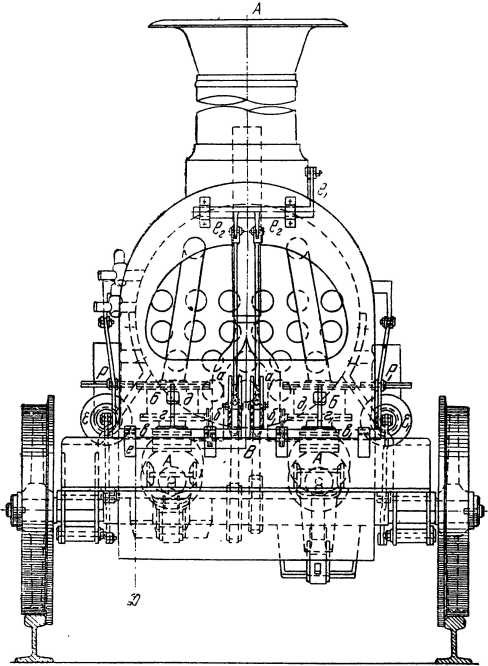 Золотники приводились в движение от эксцентриков I и II, сидящих на задней оси. Два паровых цилиндра А с золотниками Б были расположены горизонтально, а кривошипы В и B1 — под углом 90°. Эксцентриковые тяги а и a1 лежали на болтах двух вилок б и б1.