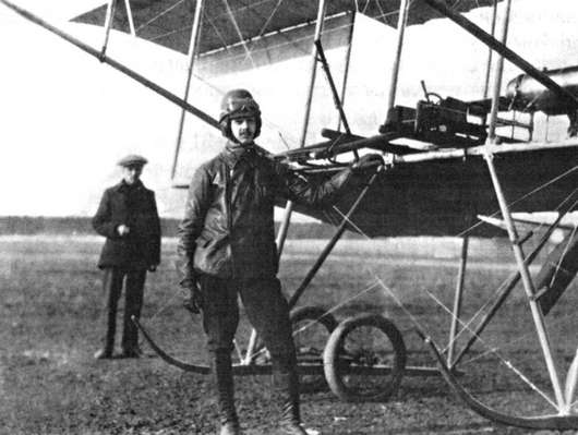 Поручик С.А. Мезенцов у биплана во время Четвертой авиационной недели на Комендантском аэродроме. Фото 1914 г.
