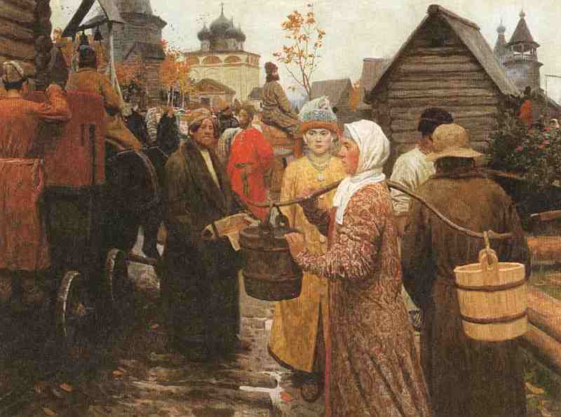 «13 августа мы приехали в последнее село пред Москвой. На другой день рано утром пристав с толмачом своим и писцом пришли к посланникам, благодарили их и всех нас за оказанные им во время пути благодеяния и просили у нас извинения, если они служили нам не так, как бы следовало. Послы подарили приставу большой бокал, а толмачу и писцу дали денег. Затем мы стали готовиться к въезду в Москву».