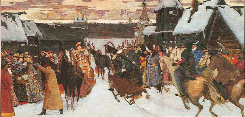 В этот день рано утром пришли пристава осведомиться, собираемся ли мы к выходу, и, увидавши, что мы были совершенно готовы, поспешно поскакали назад во дворец. Вскоре за тем были приведены нам для поезда белые лошади. В 9 часов пристава пришли снова в своих обыкновенных платьях; новые же кафтаны и высокие шапки, взятые ими из великокняжеской кладовой, несли за ними их слуги. Пристава переоделись в эти платья в передней комнате у послов и таким образом тут же, при нас, нарядились как нельзя лучше. После того мы сели на лошадей, в плащах, без шпаг (при шпаге никто не смеет являться к царю), и поехали во дворец в стройном порядке…