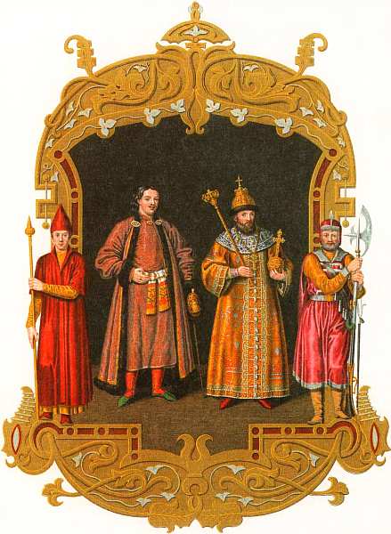 Перед приемной мы должны были пройти через одну палату со сводами, в которой кругом сидели и стояли старые почтенные мужи с длинными седыми бородами, в парчовых одеждах и высоких собольих шапках. То были гости его царского величества, то есть важнейшие купцы; одежды же на них взяты были из царских кладовых, из которых они выдаются только при подобных торжественных случаях и потом снова отбираются.
