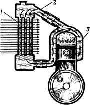 Рис. 57. Схема жидкостного охлаждения: 1 — радиатор; 2 — трубопроводы; 3 — рубашка цилиндра.
