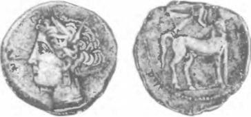 Доказательство дорийского происхождения Роды видят в нумизматике[357]. Действительно, монеты Роды, самые ранние из которых относятся к концу V или началу IV в. до н. э., чеканились по типу Сиракуз с изображением на аверсе нимфы Аретузы, но без окружающих ее в Сиракузах дельфинов, и на реверсе — четырехлепесной розы, намекающей на название города[358]. Но в том же IV в., хотя, видимо, и несколько позже Роды, сиракузский образец принимают ионийские Массалия и Эмпорион, что объясняется политическими и экономическими причинами, но не этническими резонами[359].