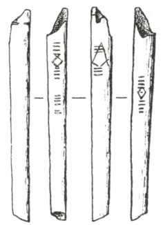Так, на одному з уламків костяних наконечників, знайдених на мезолітичному поселенні Мирне, що у Нижньому Подунав’ї, чітко помітні чотири групи насічок (рис. 27). Три з них складаються з ромбоподібної фігури в центрі, зверху і знизу біля гострих кутів якої нанесено по чотири або три паралельні насічки. Ледве помітна подібна композиція простежується й у нижній частині уламка, яка частково була стерта заполіровкою під час крепління наконечника до древка, що свідчить про попереднє графічне оформлення наконечника до його остаточного закріплення на стрілі. Чітка ритміка графічних композицій безперечно є відбитком досить сталих математичних знань, передусім розвинутої системи рахунку, операційними одиницями якої були числа 4 й 3, та геометричні надбання. Напевне, ці геометричні композиції мали магічне значення і водночас могли бути відображенням досить складних календарних (астрономічних) уявлень.