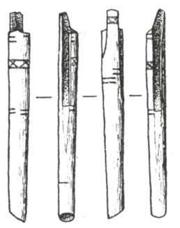 На інших уламках чітко помітні композиції з двох паралельних насічок, які наносились поперек пазів проти місць кріплення крем’яних вкладенів, що, мабуть, мало символізувати надійне закріплення крем’яних пластинок — гострого леза мисливської зброї — та сприяти йому (рис. 28).