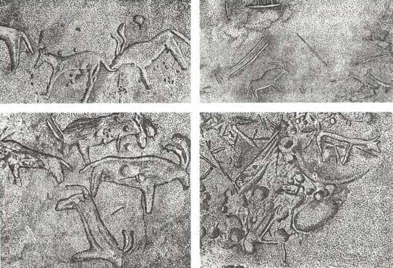 Не зачіпаючи згаданих вище дискусійних проблем, звернемо увагу читачів лише на одну групу зображень у “Гроті бика” (за іншими тлумаченнями “Грот мамонта”). Центральне місце за розмірами тут займає зображення пораненого стрілами чи списами бика (тура) в бойовій позі (рис. 30). Місця “влучення” стародавній художник акцентував штучними заглибинами на корпусі тварини. Поряд з цим зображенням досліджено ще декілька окремих композицій. Насамперед, це коло з чотирьох биків, які також “тримають” оборону (рис. 29). Зображені також три олені, коні, хижаки, градчасті огорожі, протерті заглиблення. Над фігурами людей і заглибинами піднесена людська постать мисливця-заклинателя.