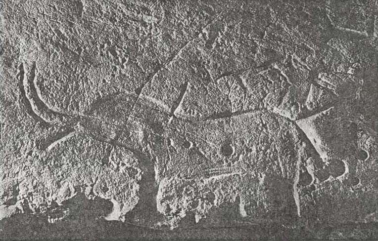 Рис. 30. Зображення бика у бойовій позиції з "Гроту бика” Кам’яної Могили, пісковик.