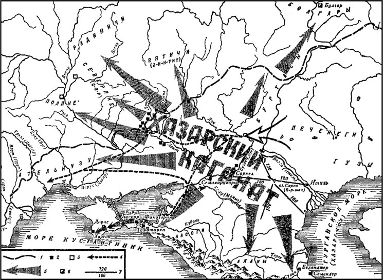Хазария в VII–IX вв. 1 – границы леса с лесостепью; 2 – хазарские крепости и города VII–IX вв.; 3 – русские города IX–X вв.; 4 – путь печенегов по южнорусским степям в конце IX в.; 5 – направления экспансии Хазарского каганата в VIII–IX вв.; 6 – столица Волжской Булгарии; 7 – расстояние от летней ставки кагана до границ личного домена