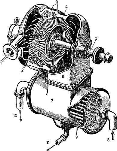 Так работает одноступенчатая турбина. 1 — подвод пара от котла; 2 — направляющие лопатки (сопла); 3 — рабочие лопатки; 4 — диск (ротор), на котором закреплены рабочие лопатки; 5 — вал; 6 — выпускной патрубок; 7 — конденсатор; 8 — подача холодной воды, 9 — охлаждающие пар трубки; 10 — отвод воды охлаждения; 11 — отвод конденсата.