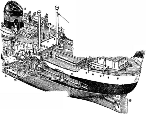Турбина с зубчатым редуктором вращает винт парохода. 1 — котел: 2 — турбина высокого давления; 3 — турбина низкого давления; 4 — турбина заднего хода (на одном валу с турбиной низкого давления); 5 — главный паропровод; 6 — зубчатый редуктор; 7 — конденсатор; 8 — подача забортной воды для конденсатора, 9 — циркуляционный насос; 10 — отвод забортной воды; 11 — вспомогательные турбонасосы; 12 — упорный подшипник; 13 и 14 — промежуточные валы; 15 — гребной винт; 16 — руль; 17 — машинный люк; 18 — дымовая труба.