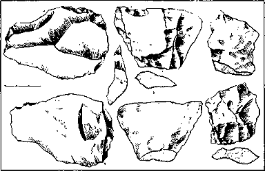 Имеются еще два менее выраженных признака. Это метка от удара — выщербленность или разможженность в той точке, на которую опустился отбойник, и ударные волны, расходящиеся на поверхности брюшка. Они особенно хорошо видны на кремневых отщепах.