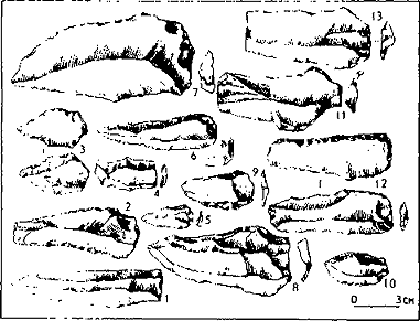 Заготовки эпохи палеолита из Средней Азии. 1, 2, 4, 5, 6, 8, 9, 12, 13 — пластины; 7, 11 — пластинчатые отщепы; 3, 10 — отщепы. Обратите внимание на различные формы этих изделий из камня, а также обработку их поверхности. Пластина несет на себе признаки преднамеренного характера обработки нуклеуса.