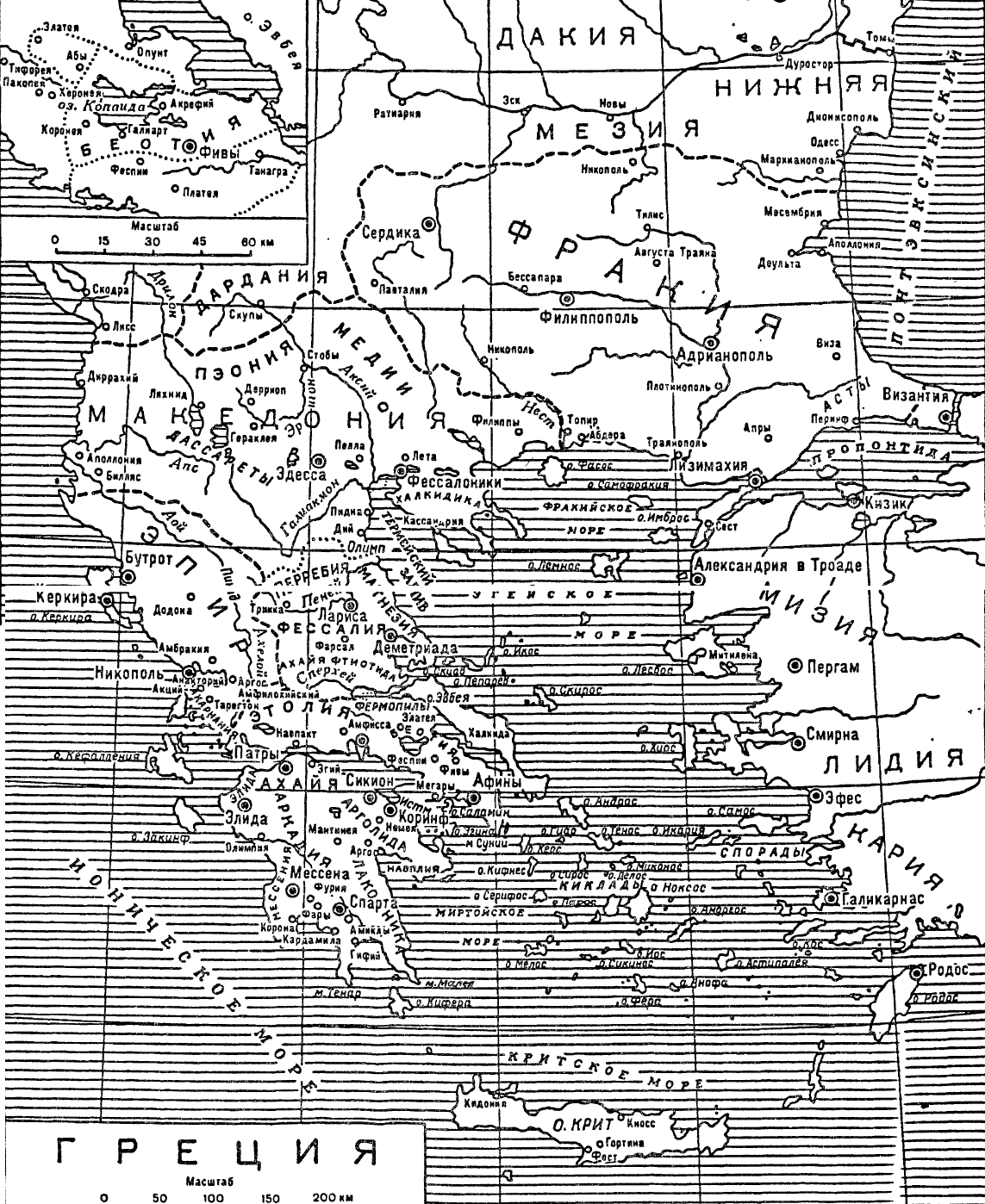 От южных областей Греции эта самая северная ее область сильно отличается как по своей национальной основе, так и по уровню культурного развития. Македоняне в собственном смысле слова, жившие по нижнему течению Галиакмона (Бистрица) и Аксия (Вардар) до Стримона, являлись по своему происхождению греческим племенем, отличие которого от более южных эллинов для настоящей эпохи не имеет уже никакого значения; к тому же эллинская колонизация распространилась на оба морских берега, причем особенно важную роль играли на западе колонии Аполлония и Диррахий, а на востоке — поселения Халкидского полуострова; однако, с другой стороны, во внутренних областях провинции имелось множество негреческих народов, так что, хотя с тех пор одни народы сменились другими, в общем эта провинция представляла в то время такую же картину, как и в наши дни. После того как кельты-скордиски, достигшие в своем продвижении границ этой провинции, были оттеснены полководцами Римской республики, внутренняя Македония была занята главным образом иллирийскими племенами на западе и на севере и фракийскими на востоке. О тех и других мы говорили уже раньше; здесь важно лишь отметить, что эти племена как в прежнее время159, так и в эпоху империи вводили у себя греческие порядки лишь с большими ограничениями. Внутренние области Македонии никогда не знали периода бурного роста городов; более отдаленные области, по существу, едва вышли из стадии чисто деревенского хозяйства.
