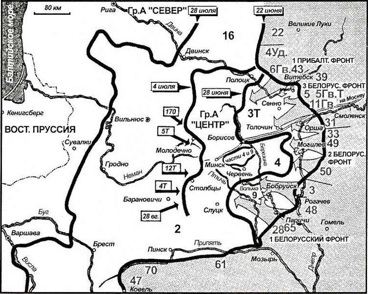 А как развивались события у 3-го Белорусского и 1-го Балтийского фронтов на северном крыле группы армий «Центр», где атакам русских противостояла немецкая 3-я танковая армия? Здесь первой стратегической целью русских являлся Витебск. «Укрепленный район» на Двине окружили двумя мощными клешнями, но прямо атаковать не стали. Еще одна иллюстрация неэффективности гитлеровской стратегии «укрепленных районов».