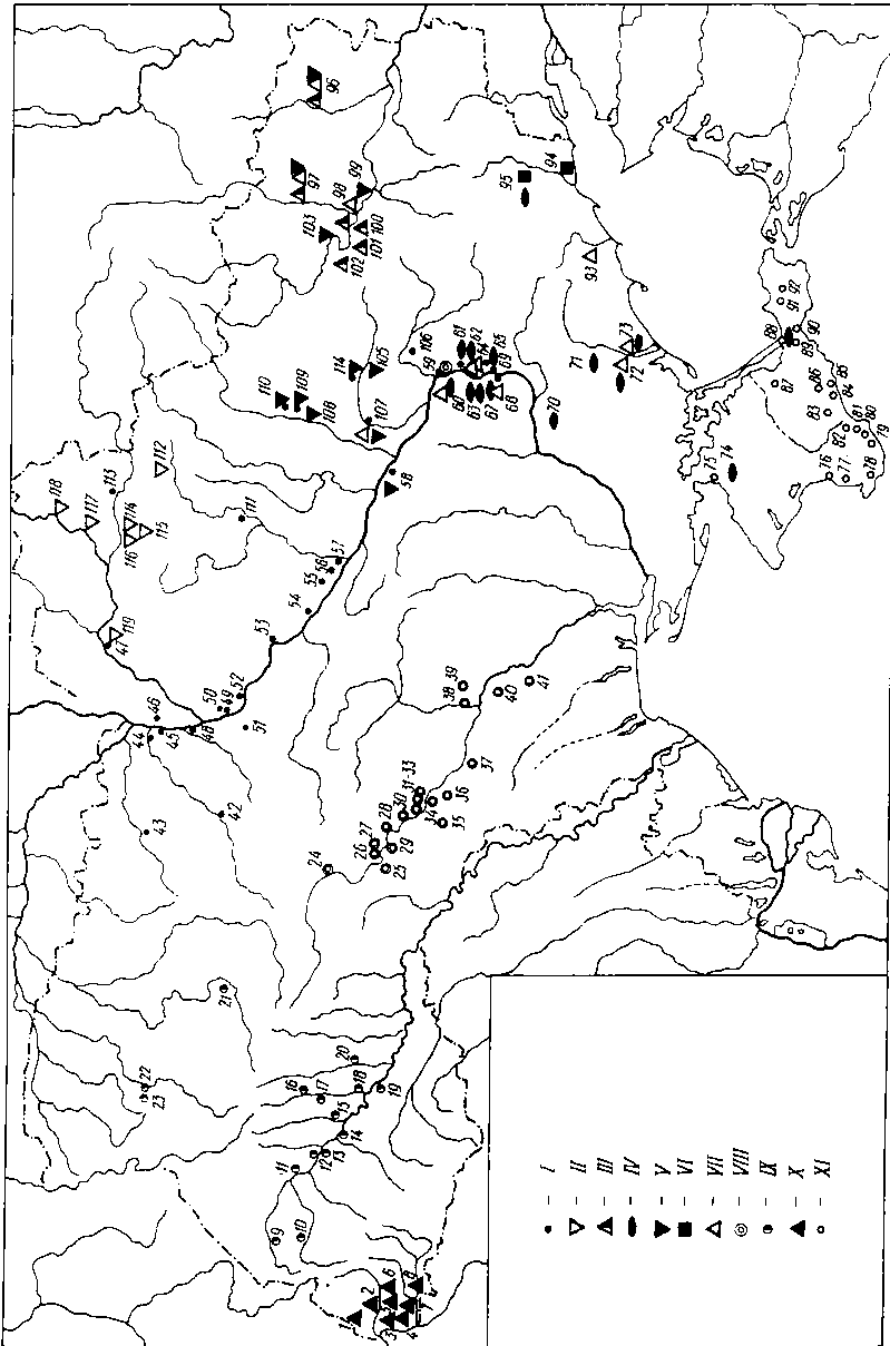 1 — Ужгород; 2 — Великі Лази; 3 — Холмці; 4 — Рільне, Рафайлове; 5 — Велика Добронь, Малі Гаївці; 6 — Заставне; 7 — Мукачеве, Мала Гора; 8 — Дрисине; 9 — Фредрополь, Нотоване; 10 — Колодниця; 11 — Бовшів; 12 — Буківна; 13 — Голосків; 14 — Незвисько; 15 — Бучач; 16 — Сухостів; 17 — Попівці; 18 — Торське; 19 — Звенячин; 20 — Синьків; 21 — Луцьк; 22 — Баїв; 23 — Сандраки-Хмельник; 24 — Печера; 25 — Королів; 26 — Самчинці; 27 — Сокільці; 28 — Глинське; 29 — Шимановське; 30 — Заньківці; 31 — Жакчик; 32 — Мельнична Круча; 33 — Скибенці; 34 — Чорнятка; 35 — Гайворон-Поліжок; 36 — Саврань; 37 — Миколина Брояка; 38 — Володимирівна; 39 — Гард; 40 — Пугач І, П; 41 — Прибузьке; 42 — гирло Гнилоп’яті; 43 — Моства; 44 — Грині; 45 — Струмель; 46 — Гастятин; 47 — Шмаївка; 48 — Домантове; 49 — Микільська Слобідка; 50 — Вишеньки; 51 — Віта Литовська; 52 — Бортничі; 53 — Козинці; 54 — Коробівка; 55 — Веремівка; 56 — Мутихи, Пищики; 57 — Бузьки; 58 — Дереївка, Успенка; 59 — Огрінь; 60 — о-ви Сурський та Кодачок; 61 — Стрільча Скеля; 62 — могильники Василівський 2 та 5, Мар’ївський, о-в Виноградний; 63 — Микільський могильник, скеля Монастирка; 64 — о. Шулаїв; 65 — могильники Ясинуватський І, Вовнизький І, Вовнизьке лівобережне поселення; 66 — Вовнизьке правобережне поселення; Вовнизький 2 могильник; 67 — Вільнянський могильник; 68 — Собачки; 69 — Середній Стіг; 70 — Лисогорський могильник; 71 — Чапаївка; 72 — Кам’яна Могила; 73 — Семенівка; 74 — Долинський могильник; 75 — Ішуньська; 76 — Таш-Аїр; 77 — Кая-Араси; 78 — Фатьма-Коба; 79 — Ат-Баш; 80 — Балін-Кош; 81 — Водопад ний; 82 — Заміль-Коба 1, 2; 83 — Алачук; 84 — Суат; 85 — Аджі-Коба; 86 — Карасу-Баши; 87 — Олексіївська Засуха; 88 — Фронтове І, ПІ; 89 — Чорна Балка; 90 — Піщана Балка; 91 — Тасунове; 92 — Олексіївна; 93 — Миколаївка; 94 — Маріупольський могильник; 95 — Роздольне; 96 — Підгорівка, Старобільське; 97 — Олександрія; 98 — гирло Осколу 1, 2; 99 — Зливки; 100 — Студенок; 101 — Бондариха; 102 — Яремівка; 103 — Вірьовкінські хутори XIV; 104 — Госпітальний Горб; 105 — Засуха; 106 — Богданівна; 107 — Турова Гора, Йосипівна, Гупалівка; 108 — Червона Гора; Біла Гора; 109 — Марки; 110 — Макухівка; 111 — Луком’я 1, 2; 112 — Черепівка; 113 — Козловка; 114 — Озаричі; 115 — Лизогубівка; 116 — Мельня; 117 — Погорілівка — Вирчище; 118 — Ображеївка; 119 — Гришівка.