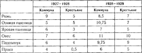 Авторы исследований дают внешне беспристрастную оценку, сравнивая коммуны и местное крестьянство. Так, П. Тадеуш, автор исследования, посвященного коммуне «Новая Жизнь», не колеблясь заявляет, что в этой коммуне слабый аграрный сектор: все усилия отданы производству скота, а также не хватает опыта и организации в производстве зерновых культур. Выработка растет с 8,5 центнеров с гектара до 12,2 центнеров в 1927 году — цифры весьма средние, если сравнивать их с данными на 1922 год и том же регионе (на Дону). В этот период крестьяне обычно собирали 10—12 центнеров с гектара.[299] Коммуна им. Ленина в 1928 году получает 14,5 центнеров ржи с гектара, что оценено автором как средняя урожайность. Однако соседний колхоз производит лишь 4,5 центнера, а средняя урожайность для региона — 9,5 центнеров,[300] так что коммуна оказывается впереди.