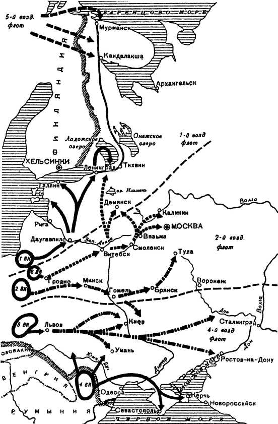 Направление ударов немецких воздушных корпусов в период с 22 июня до начала декабря 1941 г.