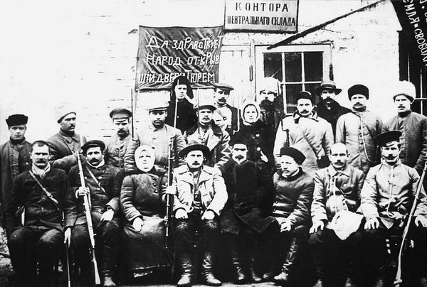 Они сидят у дверей «Конторы центрального склада». Над ними транспарант: «Да здравствует народ, открывший двери тюрем». В руках у бандитов винтовки и на лицах такое выражение, что не приведи Господи встретиться…