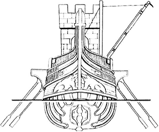 В носовой части были расположены характерная для римских боевых судов башня для пращников и абордажный трап-ворон. На акростоле обычно крепились флагштоки с боевыми символами — трофеи с захваченных судов. Этот тип биремы — чисто гребное судно, приводимое в движение 88 веслами.