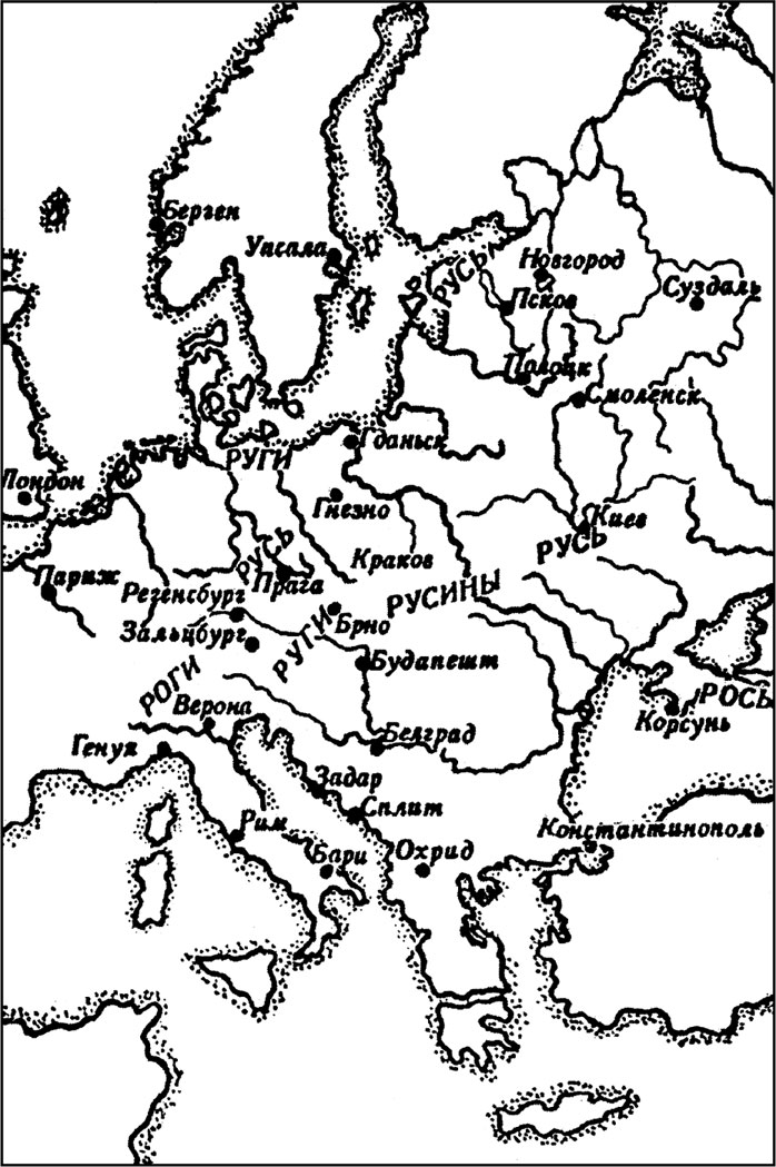 О широком распространении «русских» поселений в Центральной и Южной Европе хорошо помнил живший в XVII в. южнорусский переписчик Жития святого Кирилла, который сделал следующую приписку к Сказанию о русской грамоте: «И не токмо моравы, чехи, козари, хорваты, сербы, болгары, ляхи и земля Мунтаньская (Южное Прикарпатье и Западная Румыния. – С. Ц.), вся Далмация и Диоклития (области на западе Балкан. – С. Ц.), и волохи (жители Придунайской Валахии. – С. Ц.) быша Русь».