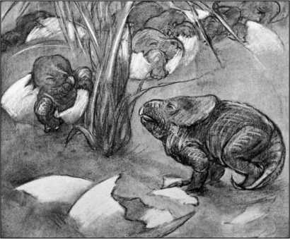 Маленькие протоцераптосы вылупляются из яиц (реконструкция Э. Фульда).