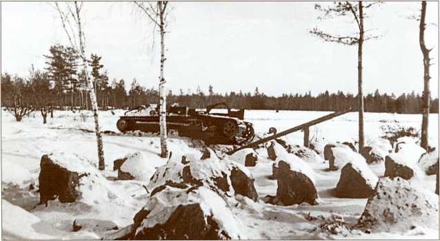 Т-28 из взвода Груздева, наехавший на фугас и уничтоженный взрывом.