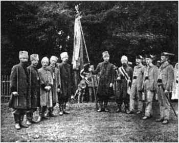 В «Сечах» использовалась казацкая терминология: кошевой, есаул, писарь, казначей, обозник, отличием была малиновая лента (цвет куреня пластунов), через плече — пернач, булава, из одежды — шаровары, чемереки[36], высокие казацкие шапки. Интересно, что сечевые стрельцы, по воспоминаниям современников, принимали присягу Украинским князьям, гетманам и Запорожской Сечи.