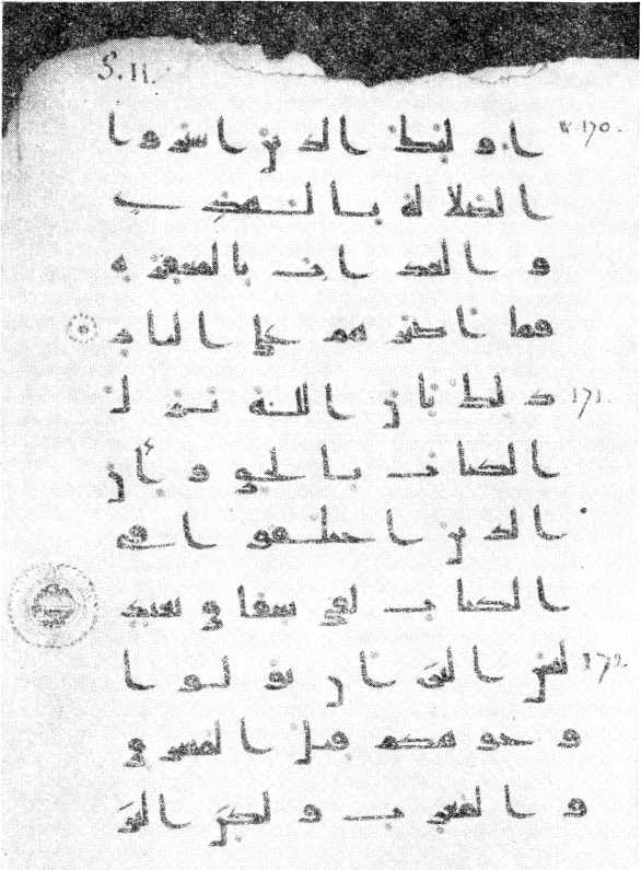Отрывки Корана, написанные на пергаменте древнеарабским (куфическим) письмом в VII–VIII веках. Хранятся в Государственной Публичной библиотеке им. Салтыкова-Щедрина в Ленинграде.