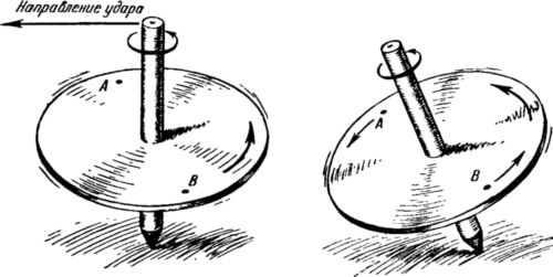 Под воздействием удара волчок наклонится влево, точка А на диске станет при этом двигаться вниз, а точка В — вверх. Однако по закону инерции обе точки, стремясь сохранить прежнее направление движения, окажут сильное сопротивление действию удара. В результате этого возникает так называемая прецессионная сила, увлекающая волчок в сторону от направления действующей силы.