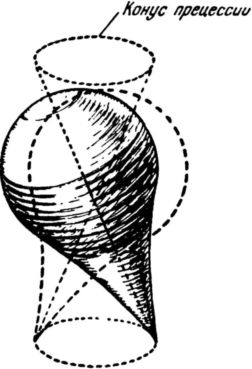 Проделав одну за другой несколько попыток свалить быстро вращающийся волчок, мы обнаружим, что при каждом толчке усиливается покачивание его оси. Наконец, оно окажется значительным. Теперь нетрудно заметить, что ось волчка описывает в пространстве определенную фигуру (рис. 13).