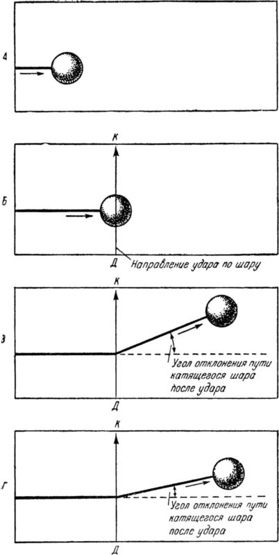 В результате этого удара произойдет незначительное изменение первоначального направления, причем шар теперь покатится с несколько большей скоростью (рис. 14, В).