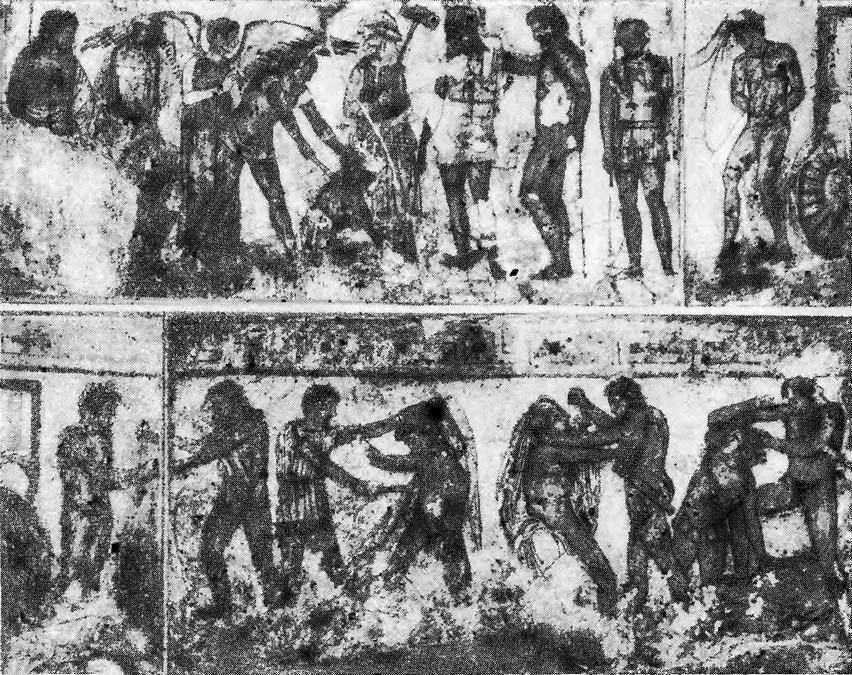 Не так легко разобраться в эпизоде, связанном с воцарением Сервия Туллия, известного также через императора Клавдия[12] под этрусским именем Маcтарны (Mastarna). Это имя сближается в какой–то мере с латинским словом magistratus, из чего следует сделать вывод, что Mastarna по–этрусски было не личное имя, а обозначение некоей выборной должности. Легенда утверждала за ним рабское происхождение. Скептические умы древности[13] подвергали многое сомнению в этом легендарном рассказе, но им не казалась почему–то неправдоподобной самая возможность появления раба в Риме в качестве магистрата и царя. Фреска в знаменитой могиле Франсуа в Вульчи[14] изображает сцену освобождения Мастарной (Mastarna) Целия Вибенны (Caile Vipinas) из оков. При этом, оказывается, убит некий Гней Тарквиний Романус (Gneve Tarchun… Rumach). Небезынтересно отметить, что в эпоху республики эпитет Romanus в качестве родового имени принимали отпущенные на волю государственные рабы [15] (рабы же частновладельческие – родовое имя господина). Это позволяет, может быть, видеть в персонаже, носящем имя Гнея Тарквиния Романа, не представителя самого царского рода Тарквиниев, а кого–либо из его клиентов, тогда как освобождаемый из оков Целий Вибенна символизирует лицо (или категорию лиц), освобождаемое из рабства. Эти соображения позволяют представить себе воцарение Маcтарны в Риме не в качестве дворцового переворота, а как результат социальной борьбы. Они, вероятно, подкрепляются некоторыми другими сообщениями о попытках захвата власти в Риме отдельными лицами с помощью рабов и клиентов[16], которые иногда считаются легендарными. Однако при сопоставлении всех тех общих черт, какие нам удалось наблюдать, изучая происхождение и положение древнейших римских рабов и плебеев–клиентов, подобные рассказы вполне могут претендовать на известную историчность, и речь о [151] них поэтому будет вестись еще ниже в несколько другой связи.