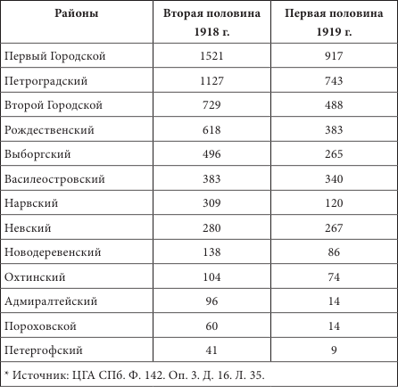 Меры по улучшению работы правоохранительных органов, несмотря на все трудности в этом деле, давали определенные результаты. В 1918–1919 гг. милиция и уголовный розыск обезвредили несколько крупных банд грабителей, в частности шайку Александрова (Паныча), хранившего награбленные ценности в склепе на Охтинском кладбище, 16 налетчиков во главе с Афанасьевым (Мишкой-портным), на счету которых было 20 грабежей на сумму около миллиона рублей[348]. К 1919 г. удалось добиться значительного снижения уличной преступности, в городе стало спокойнее. Если, к примеру, за июль 1918 г. было зарегистрировано 635 уличных краж и грабежей и 245 квартирных[349], в августе 1919 г. было отмечено лишь 17 уличных краж и 497 квартирных[350]. Хотя количество квартирных краж выросло вдвое, это были в основном мелкие кражи. Если судить по информации суточных рапортов о происшествиях, меньше стало квартирных грабежей, сопровождавшихся насилием в отношении хозяев, зато возросло число случаев проникновения воров в квартиры в отсутствие жильцов путем подбора ключей. Кроме того, обитатели коммунальных квартир, которых в городе становилось все больше в результате проведения так называемых уплотнений, часто обворовывали друг друга. В целом за первую половину 1919 г. по городу было зарегистрировано 3806 хищений, 19 налетов и 58 убийств (за вторую половину 1918 г., соответственно, 5902, 54 и 153)[351]. Среди районов города первое место по уголовной статистике занимал Первый Городской район, за ним следовали Петроградский и Второй Городской. Самая спокойная обстановка была в Пороховском и Петергофском районах (см. табл. № 1).