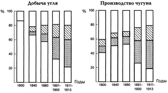 Добыча угля и производство чугуна в Англии, Германии и США в 1800–1913 гг.