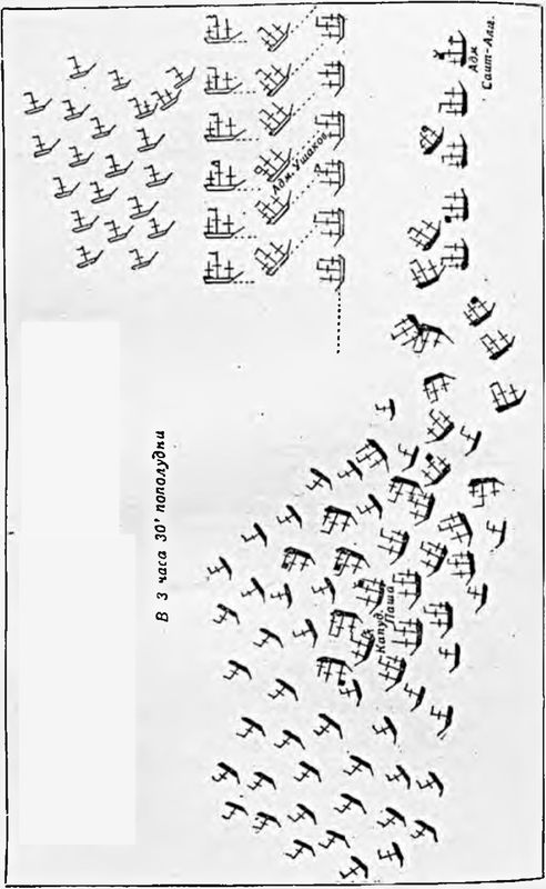 Появление русских кораблей в середине турецкого строя привело турок в сильнейшее замешательство. Их корабли один за другим уходили из линии, перемешивались и «друг друга били своими выстрелами».