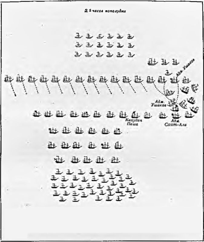 Капудан-паша с несколькими кораблями бежал под ветер и неумело строил боевую линию, часто меняя галсы. Заметив эти движения капудан-паши, Ушаков, всё ещё находясь в походном порядке, энергично двинулся на него. Но опытный алжирский адмирал Саид-Али, успевший построить свою эскадру, увидел, какая опасность грозит Гуссейну; он быстро вышел на своём лёгком корабле «Капудание» вперёд и увлёк за собой весь турецкий флот. Таким образом была построена боевая линия на левом галсе.