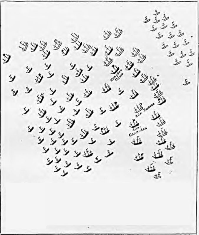 Схема 6. Замешательство в турецком флоте. Турки, обрубив якорные канаты, налетая друг на друга, беспорядочно бегут в море. Алжирский адмирал Саид-Али, построив свои корабли в боевую линию, старается увлечь за собой весь турецкий флот.
