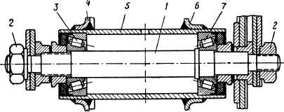 Рис. 132. Ступица колеса: 1 — ось ступицы колеса; 2 — гайки крепления оси колеса; 3 и 7 — роликовые подшипники ступицы; 4 и 6 — фланцы втулки; 5 — втулка ступицы.