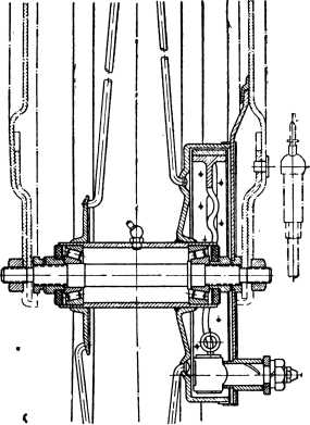 Средняя распорная втулка 15 с закрепленными на ней по краям шайбами служит камерой для консистентной смазки, которая с помощью шприца вводится через масленку 20 и постепенно поступает к подшипникам через небольшие кольцевые зазоры между наружными поверхностями шайб и ступицей.