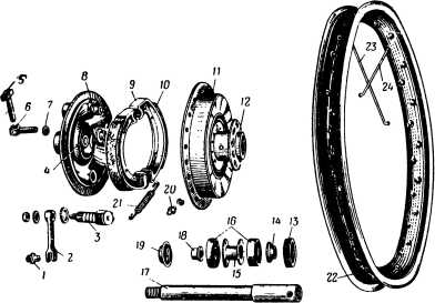 Рис. 135. Колесо мотоцикла М-72 (в разобранном виде): 1 — втулка крепления троса привода ручного тормоза; 2 — рычаг тормозного валика; 3 — тормозной кулачок с валиком; 4 — диск тормоза переднего колеса; 5 — регулировочный винт троса ручного тормоза; 6 — кронштейн регулировочного винта ручного тормоза; 7 — гайка крепления кронштейна регулировочного винта ручного тормоза; 8 — упорный валик тормозных колодок; 9 — тормозная колодка; 10 — обшивка (накладка) тормозной колодки; 11 — тормозной барабан; 12 — втулка колеса; 13 — гайка крепления подшипников колеса с сальником; 14 и 18 — распорные втулки ступицы колеса; 15 — средняя распорная втулка ступицы колеса; 16 — шариковые подшипники колеса; 17 — ось колеса; 19 — втулка с маслосъемной нарезкой; 20 — масленка; 21 — пружина тормозных колодок; 28 — обод; 23 — спица длинная; 24 — спица короткая.