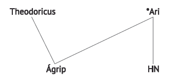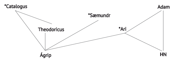 * Обозначения в схемах 1 и 2: ?grip – «?grip af Noregs konunga sggum» («Обзор саг о норвежских конунгах»); *Ari – «*konunga ?vi» («'Жизнеописание конунгов») Ари Мудрого; HN – «Historia Norwegi?» («История Норвегии»); Theodoricus – «Historia de antiquitate regum Norwagiensium» («История о древних норвежских королях») Теодорика Монаха; X – неизвестный источник.