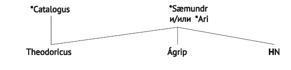 Т. М. Андерссон[166] обращает внимание на позицию Бьярни Гуднасона[167], вернувшегося к старому взгляду А. Йессинга и Финнура Йоунссона[168] и заключившего, что Теодорик был хорошо знаком с работами и Ари, и Сэмунда. Развивая мысль Бьярни Гуднасона, Андерссон полагает, что авторы всех трех кратких норвежских обзоров были знакомы с трудами Сэмунда и Ари (см. схему 4). Отвергая высказанное 3. Байшлагом[169] мнение, что у трех кратких норвежских обзоров нет общего письменного источника и они представляют собой независимые записи очень схожих устных рассказов, Андерссон все же настаивает на непременном наличии у них письменного источника, хотя (в результате последних пятидесяти лет изучения королевских саг) и не вполне ясно, какого.